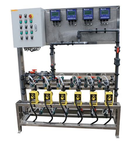 The circulating water dosing device consists of a dosing bucket, a mixer, a metering pump, a PLC control system, and pipeline valves. All system devices are centrally installed on the same base platform,